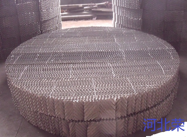 9.第一層填料與填料支承的相對方位參看圖紙。以后每層填料走向與其下層填料波紋片走向呈90度角交錯安裝;每塊填料進塔后,應按序號擺放;填料塊就位前應用裝填工具將端頭整形使其與塔壁相符;填料塊之間應擠緊,不留縫隙,各塊就位后,用裝填工具調整各處的松緊度,并將各處踩實,必須使上下盤之間緊密接觸,填料安裝過程中不得帶入任何雜物,鐵絲及其它包裝物不得留在塔內。