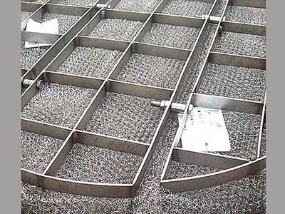 組合網的創制提高了清除細粒霧氣的分離效率。編織的絲網除沫器,由于它從蒸汽和氣流中除去液滴的效率高,費用低,已得到了工業戰線的廣泛承認,在作業的設備中,如蒸發器,洗滌器和蒸餾塔中安裝這種絲網霧沫分離器是很容易的。這只需要在直徑為6呎的設備中加一個支撐圈,把它固定在容器的內壁上,即可安裝絲網除沫器了。絲網除沫器在底座和頂部柵條之間有夾層的絲網。大型容器的中間須加一個圓形環。絲網除沫器它可以通過設備的開口端插進容器內。