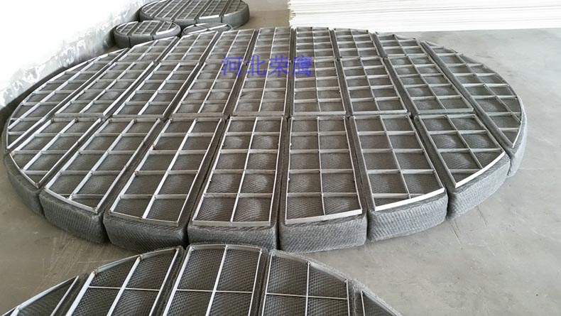 根據介質粘度的不同和液沫脫除要求的不同 ,絲網除沫器一般采用線徑為 0.25 ~ 0.30 mm 的合金絲,線間距約為 6 mm,編織成圓筒狀 ,再把它展平成寬度為 300 ~ 450 mm的帶狀絲網, 用數塊或數十塊網板重疊 ,捆以金屬絲 ,置于容器內格架上, 氣流自下而上通過絲網層 。絲網除沫器型式上分類:SP型(標準型)絲網除沫器、DP型(高效型)絲網除沫器,HP型(高穿透型)絲網除沫器。